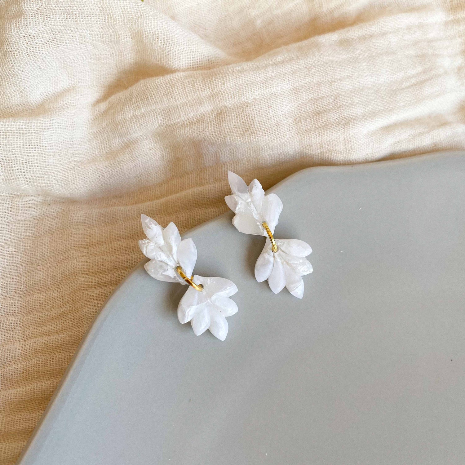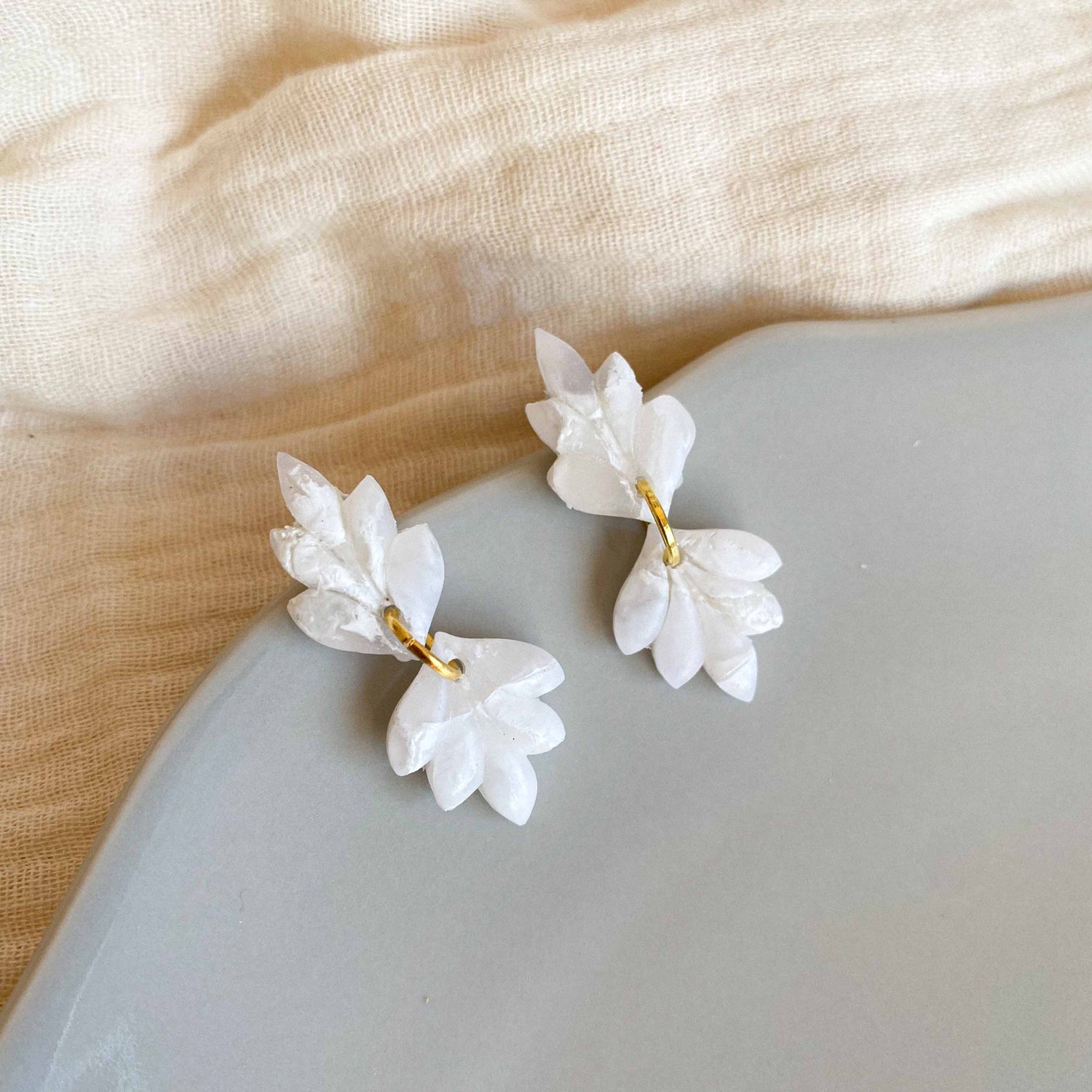 Polymer clay mini leaf stud style earrings in a white crystal design.