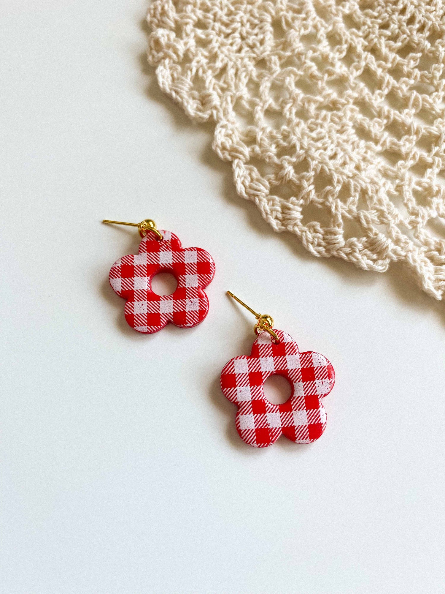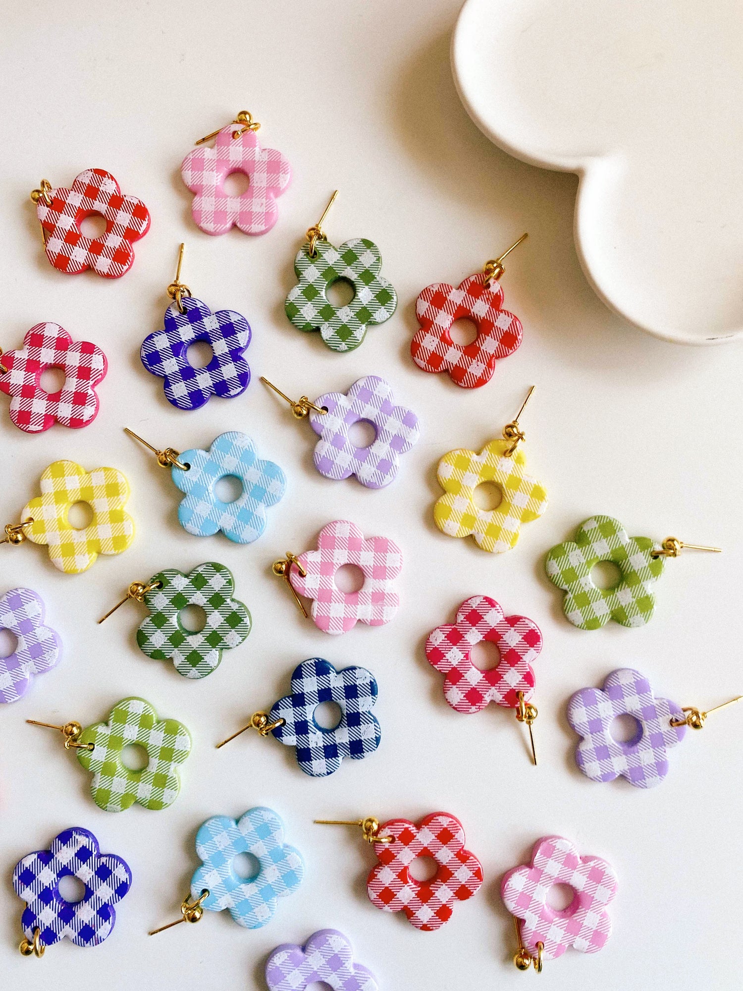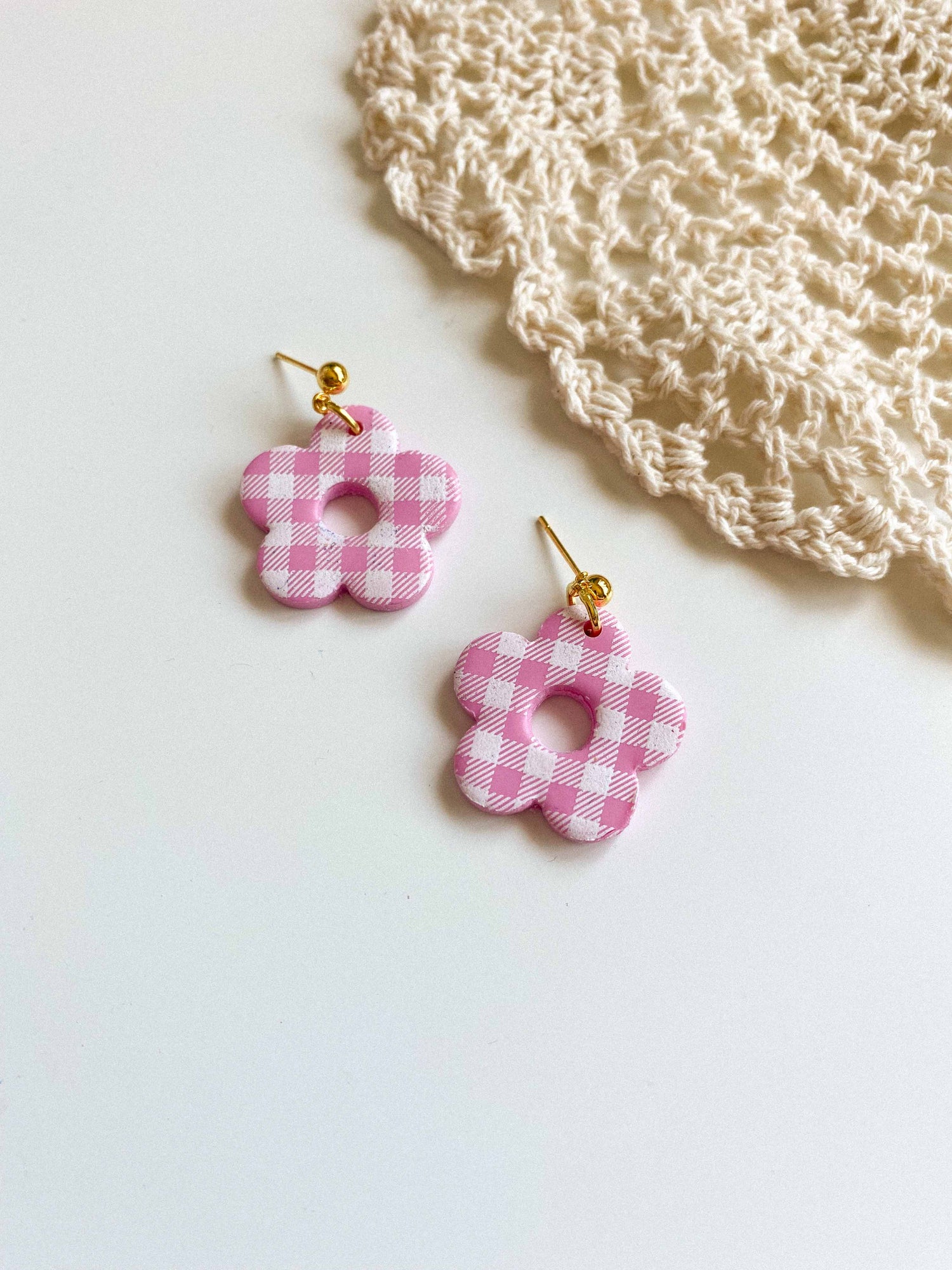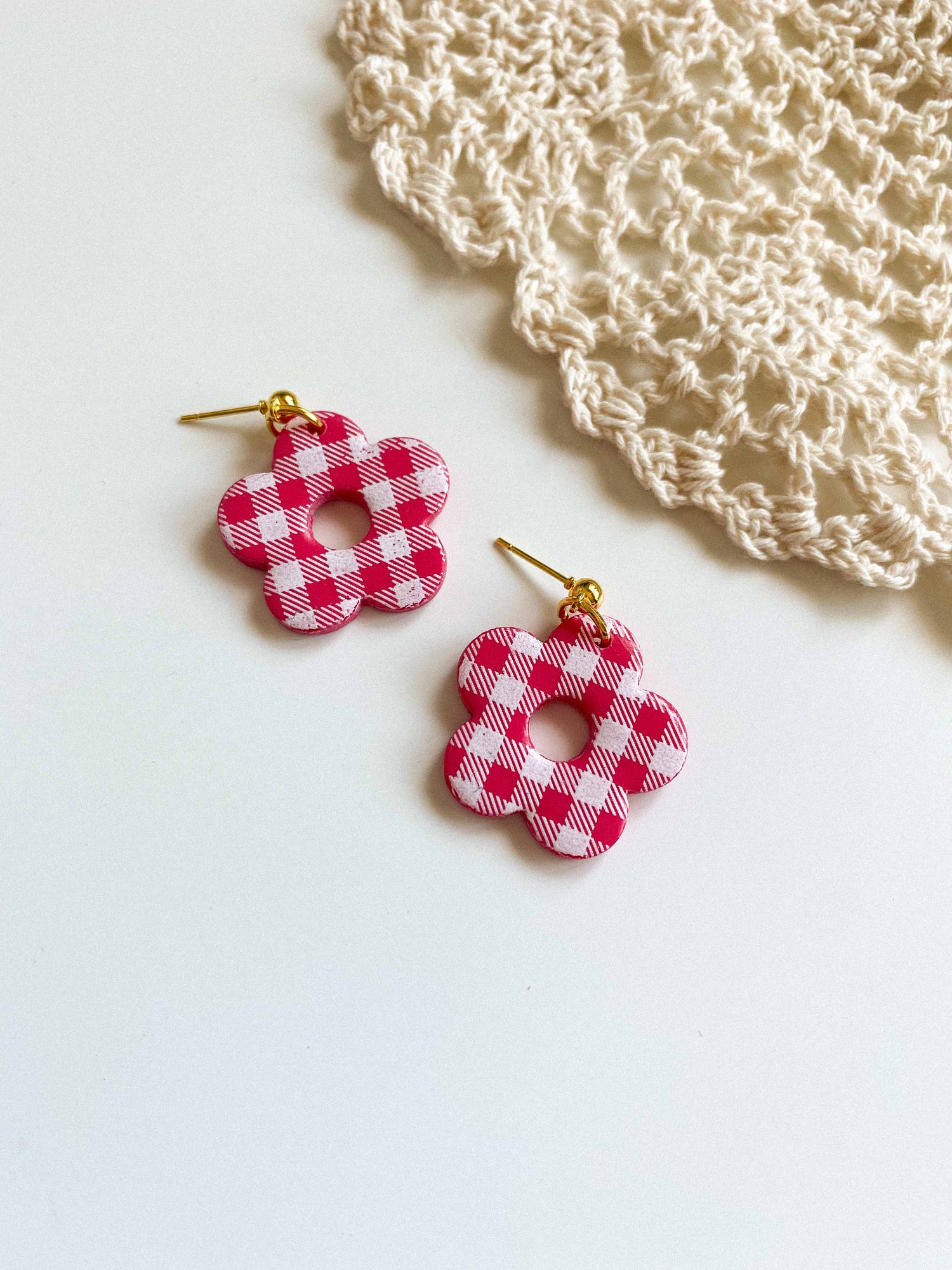 - Gingham flower style earrings made from lightweight polymer clay