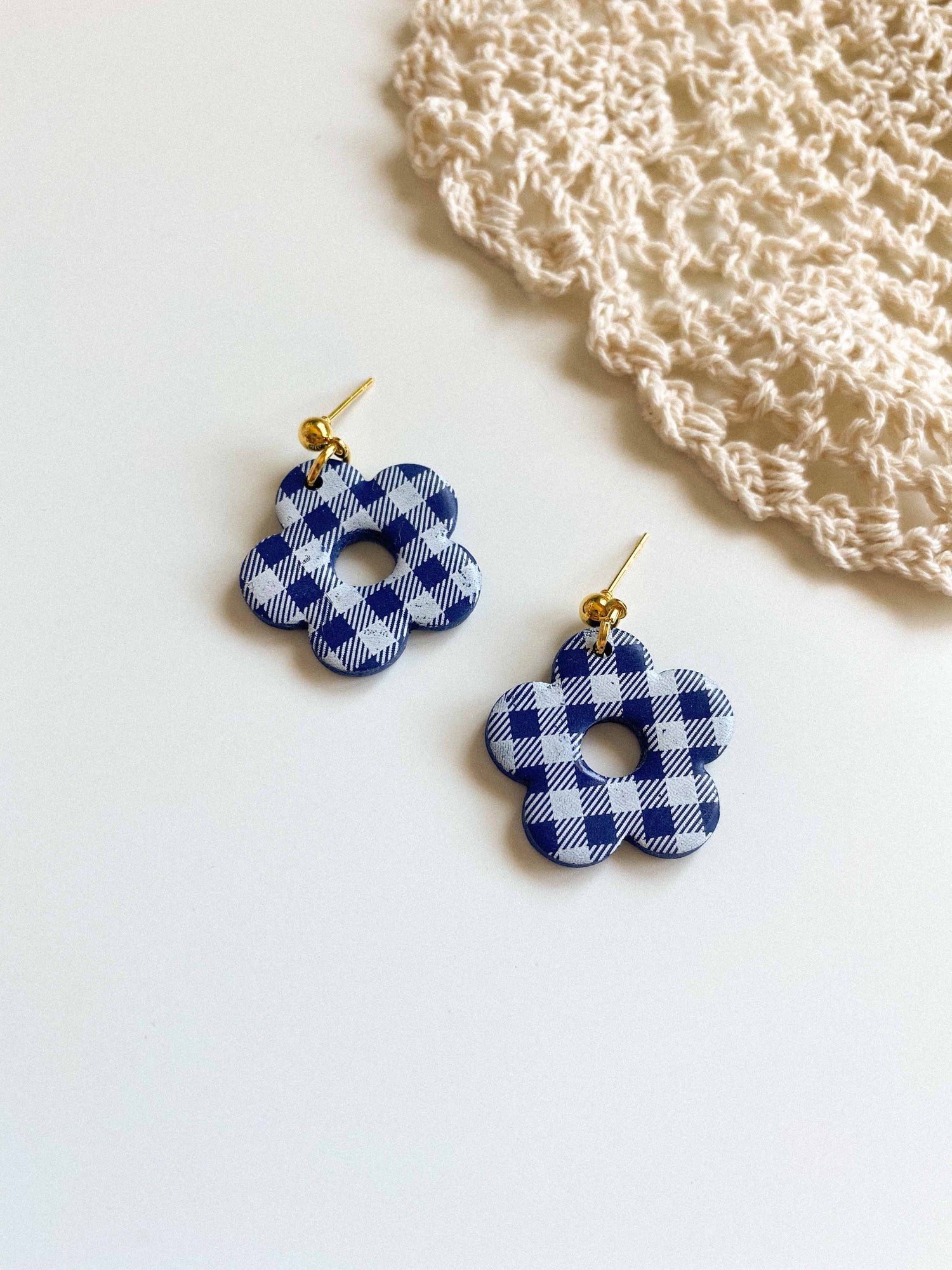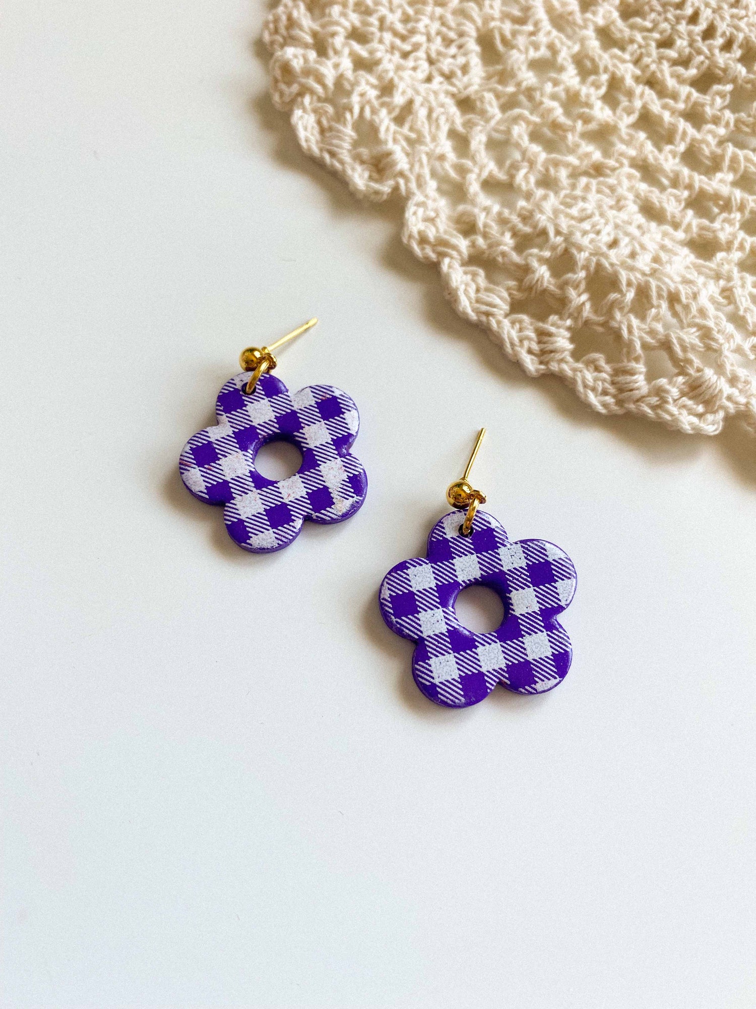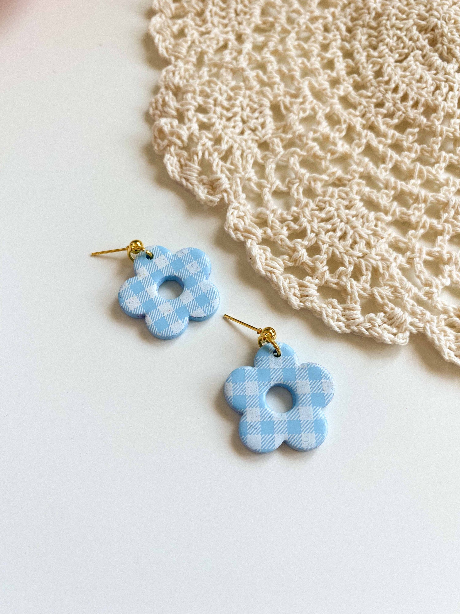 - Gingham flower style earrings made from lightweight polymer clay