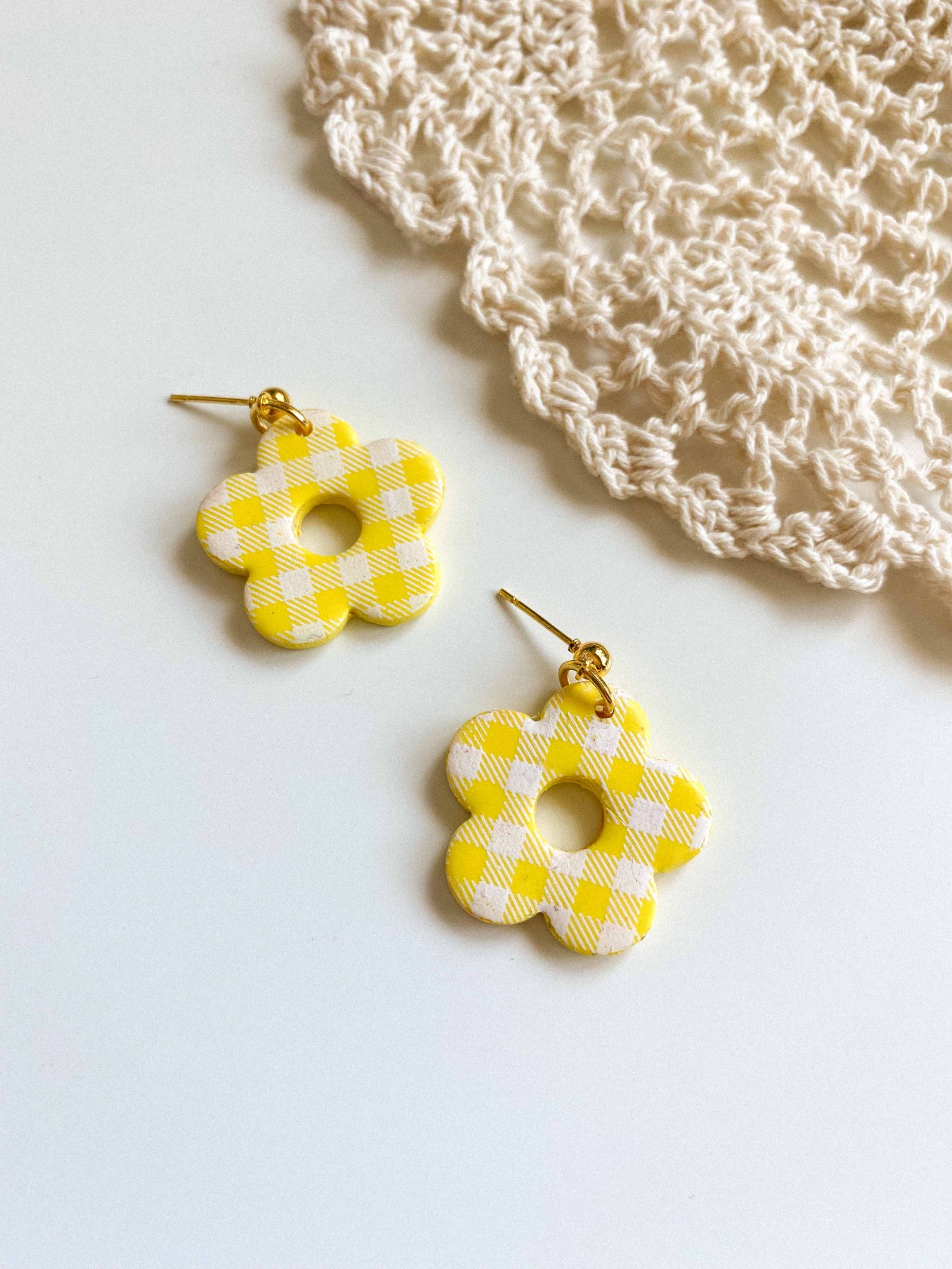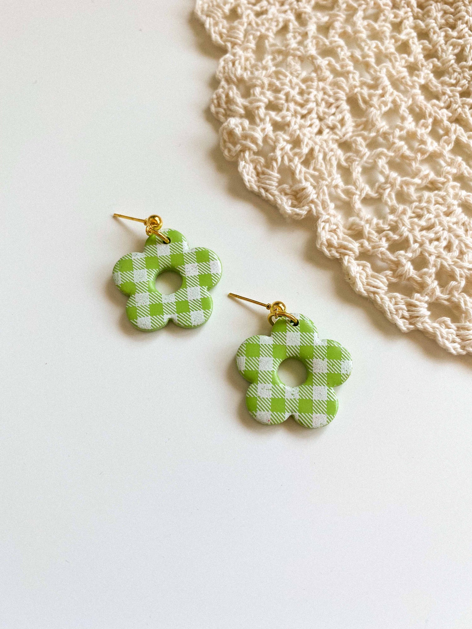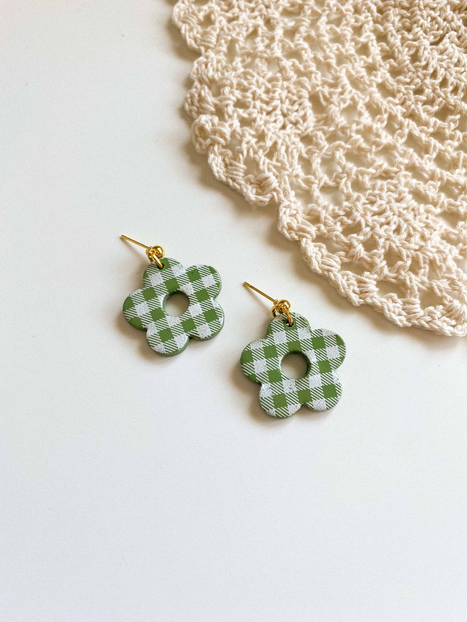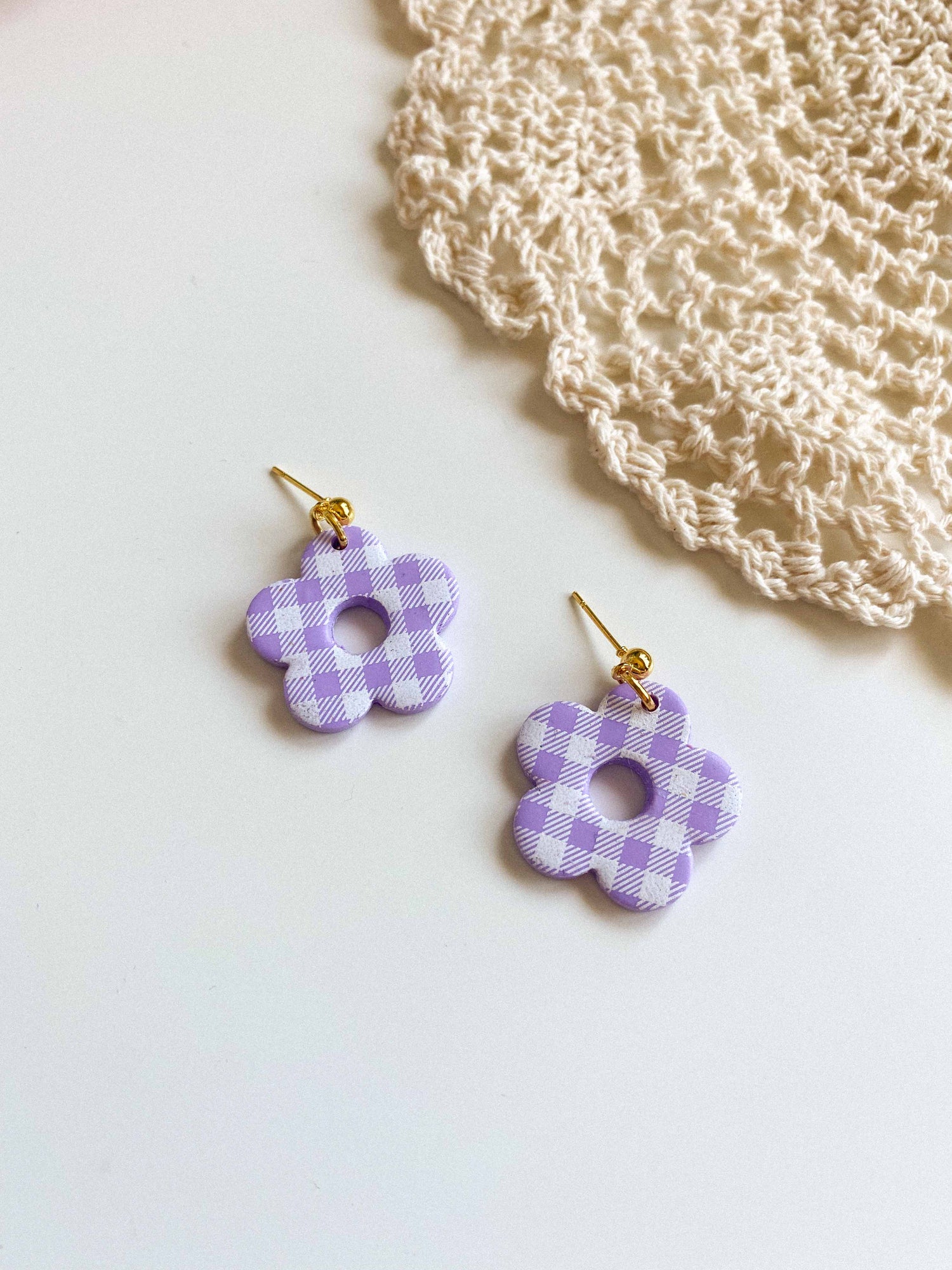 - Gingham flower style earrings made from lightweight polymer clay