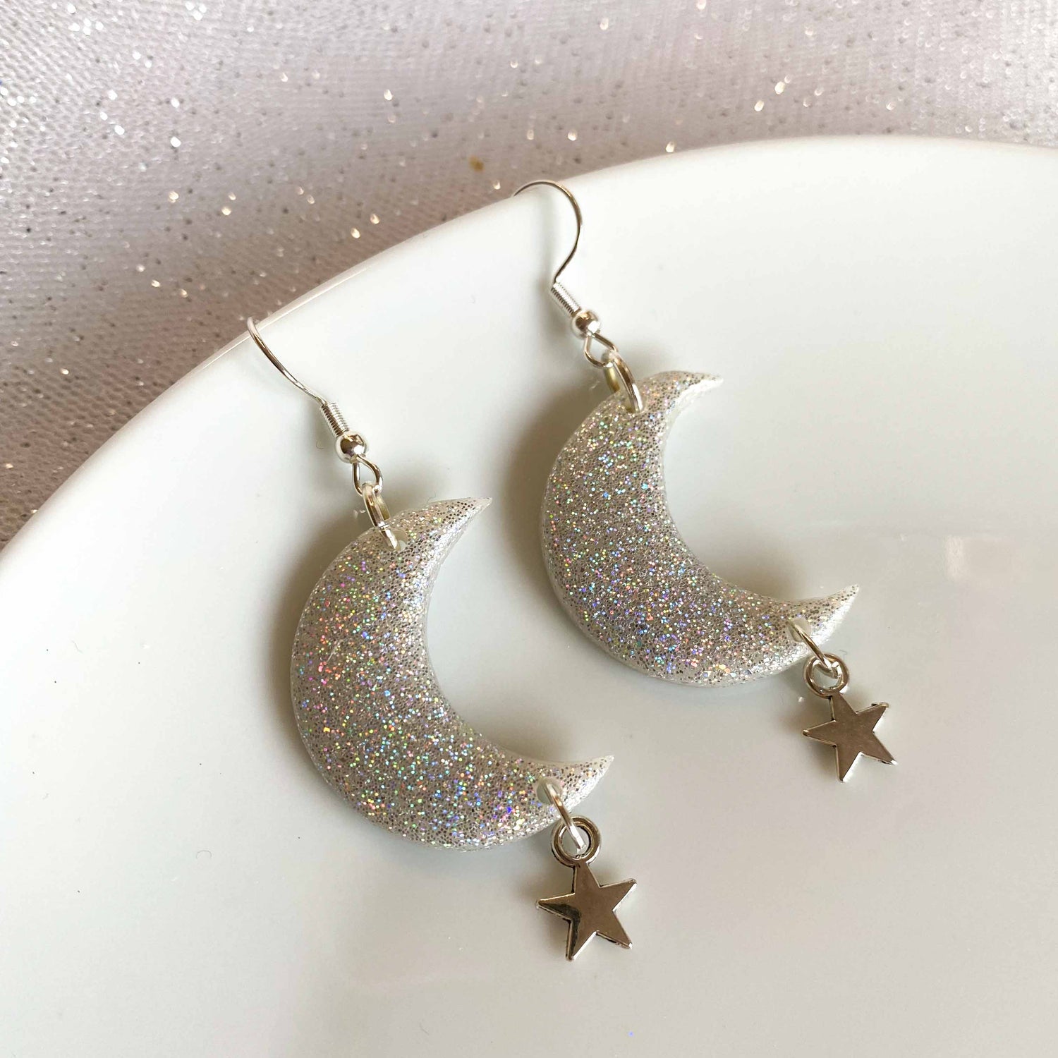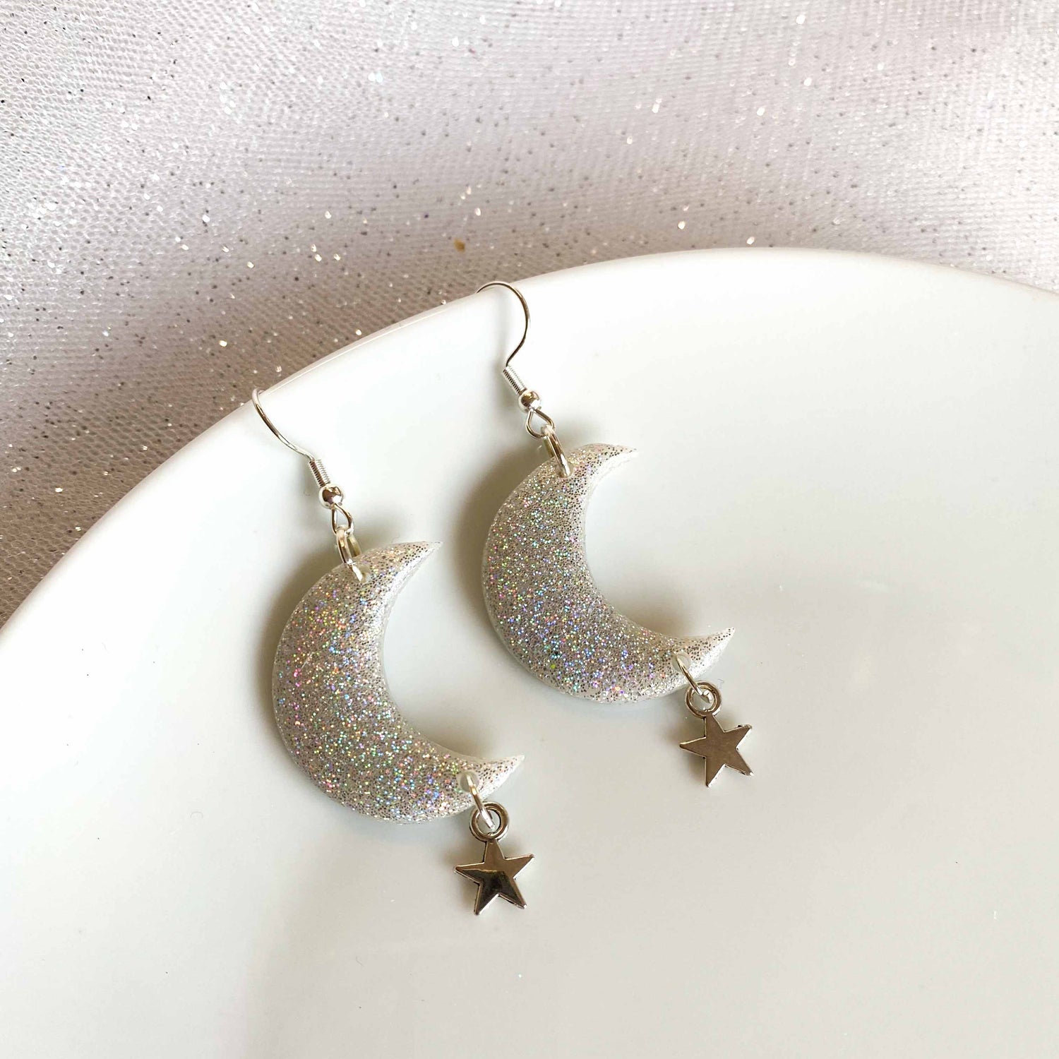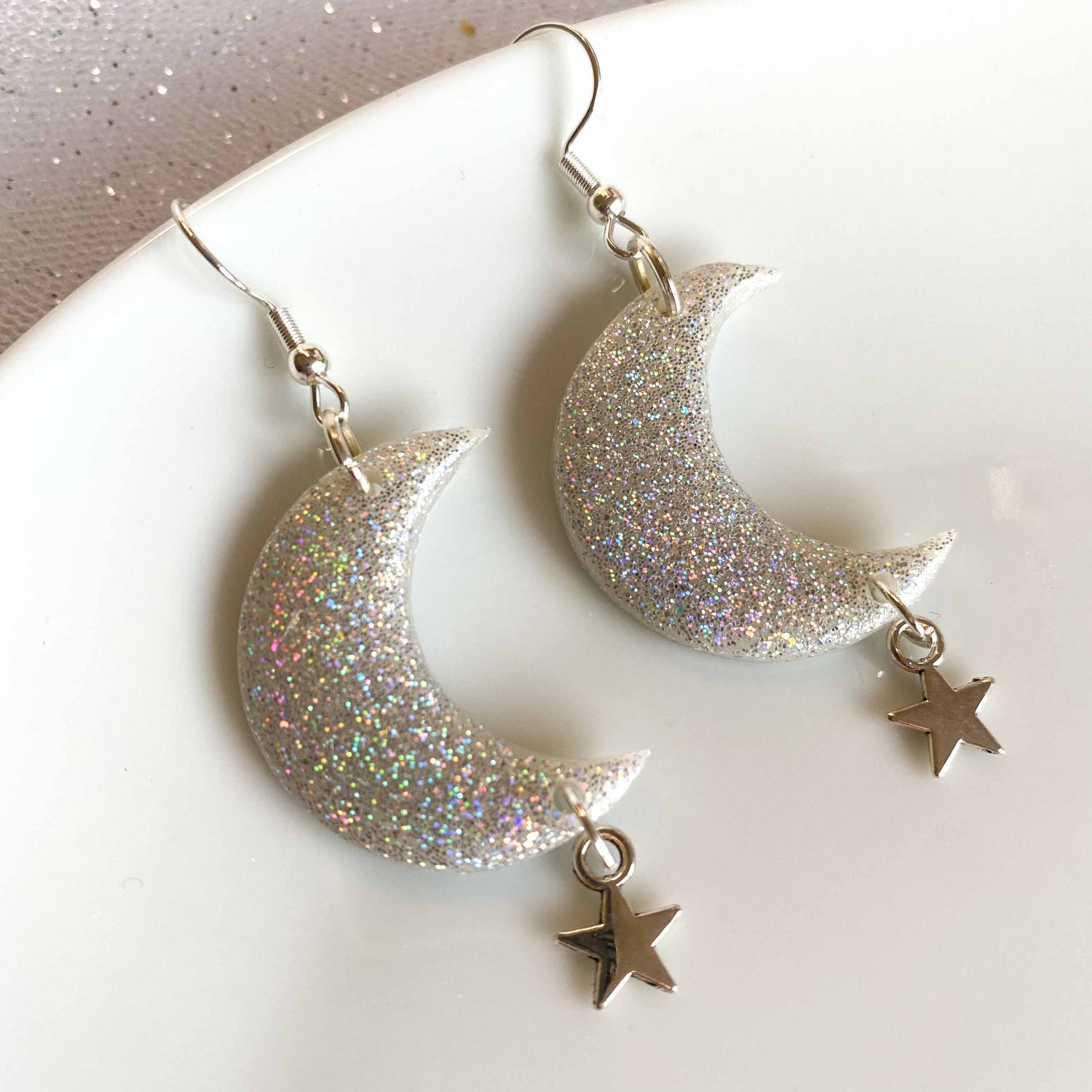 Polymer clay moon style earrings in a holographic finish with star charms.
