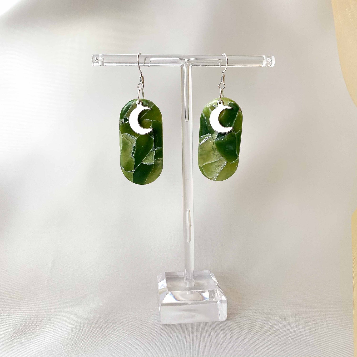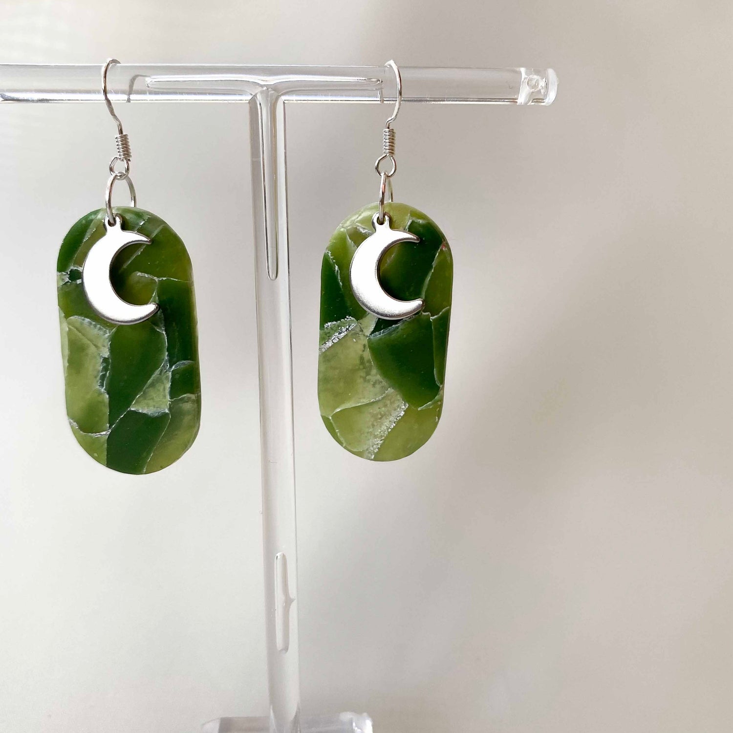 Handmade earrings made with a green quartz and silver leaf design, with silver moon charms.