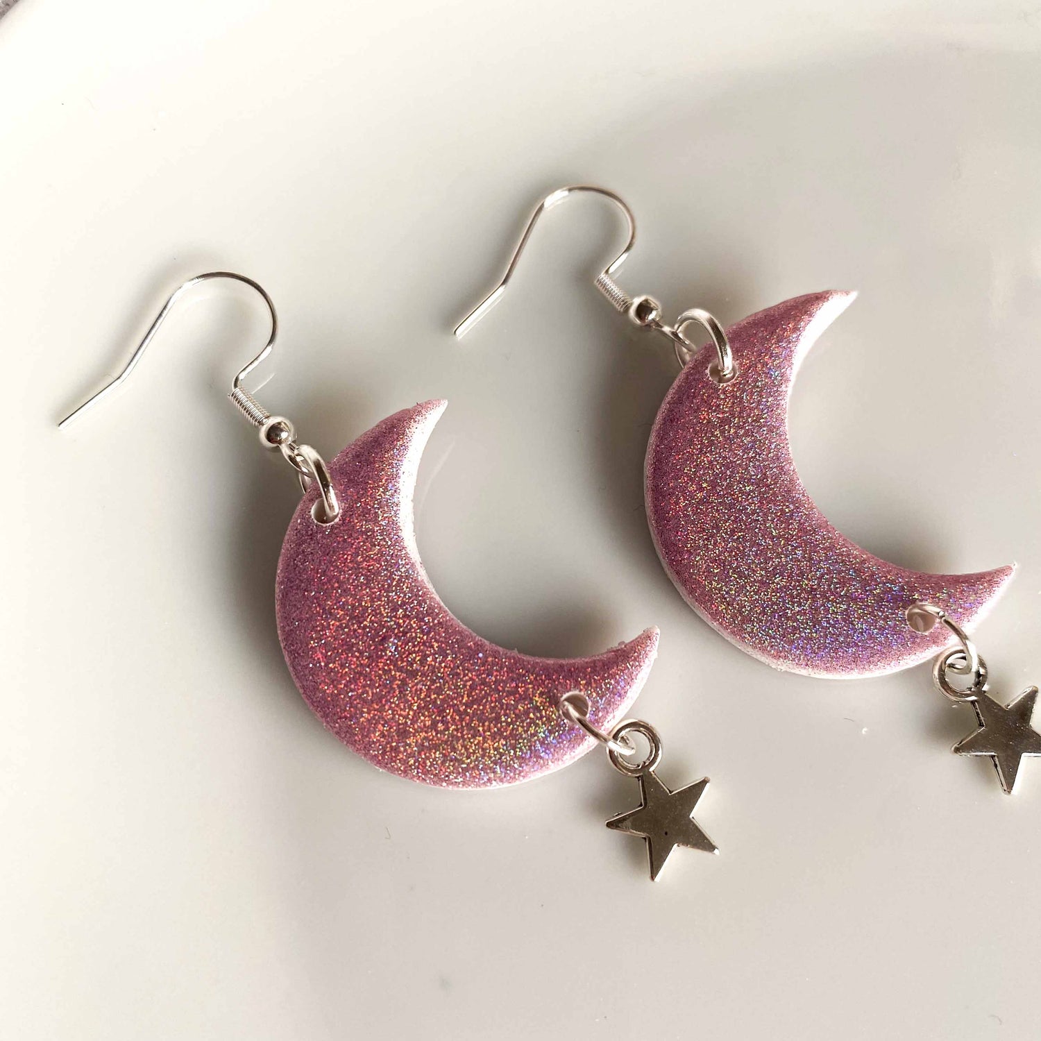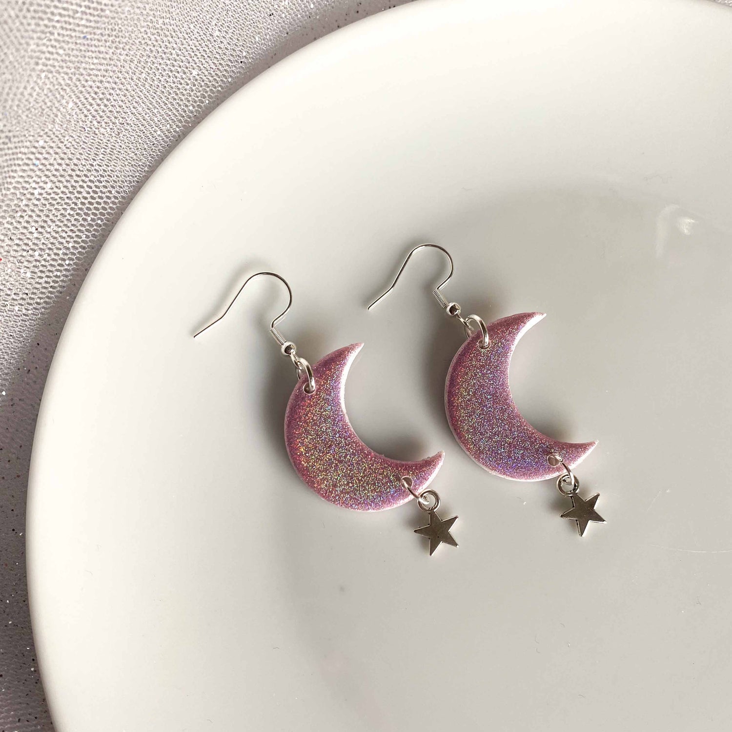 Polymer clay moon style earrings in a holographic finish with star charms.