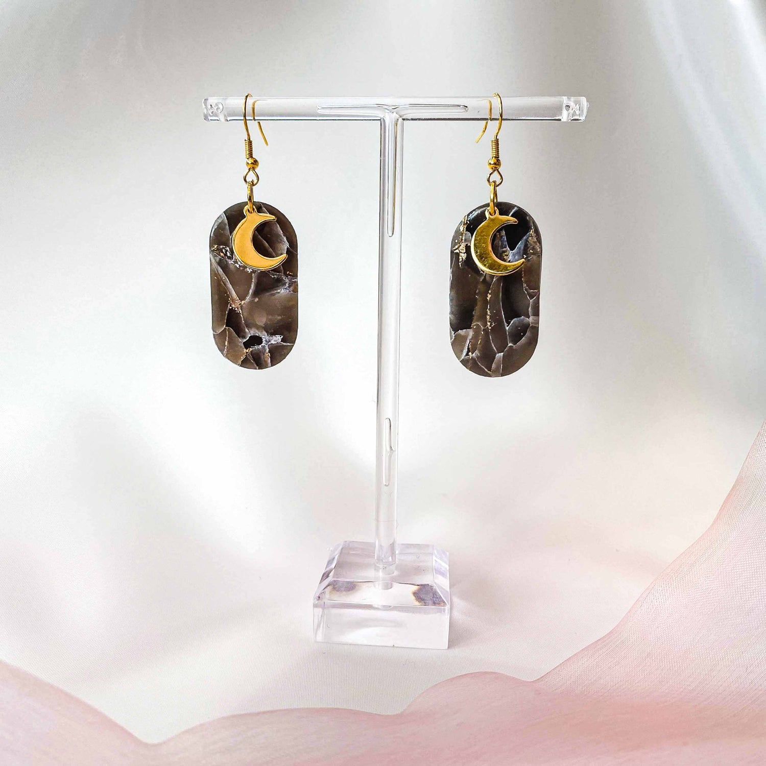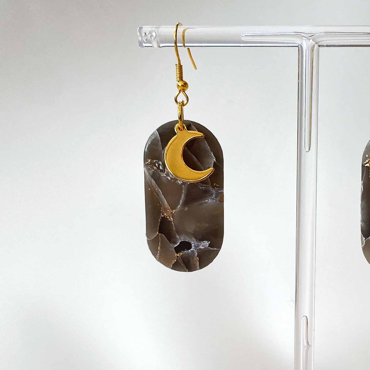Handmade earrings made with a smoky quartz design, featuring gold leaf and gold moon charms.