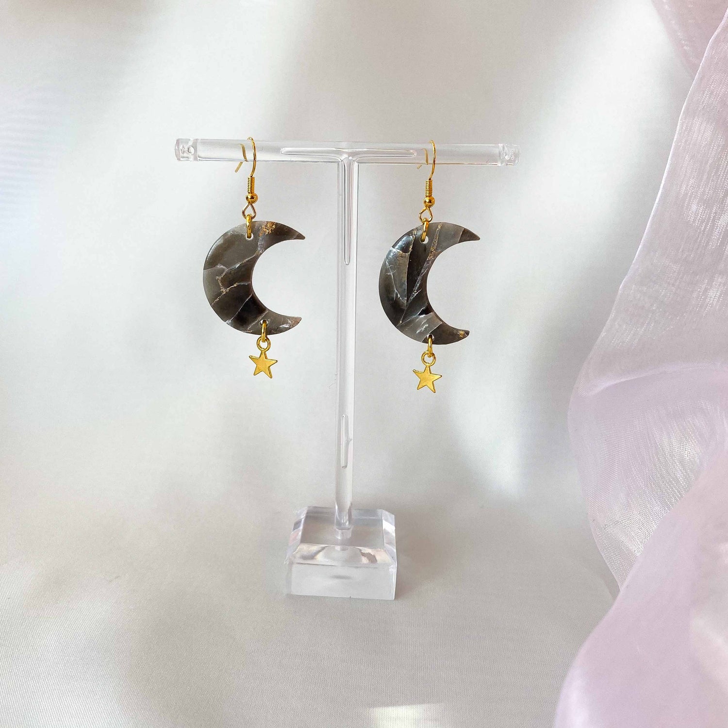 Handmade moon earrings made in a grey quartz design, with star charms.
