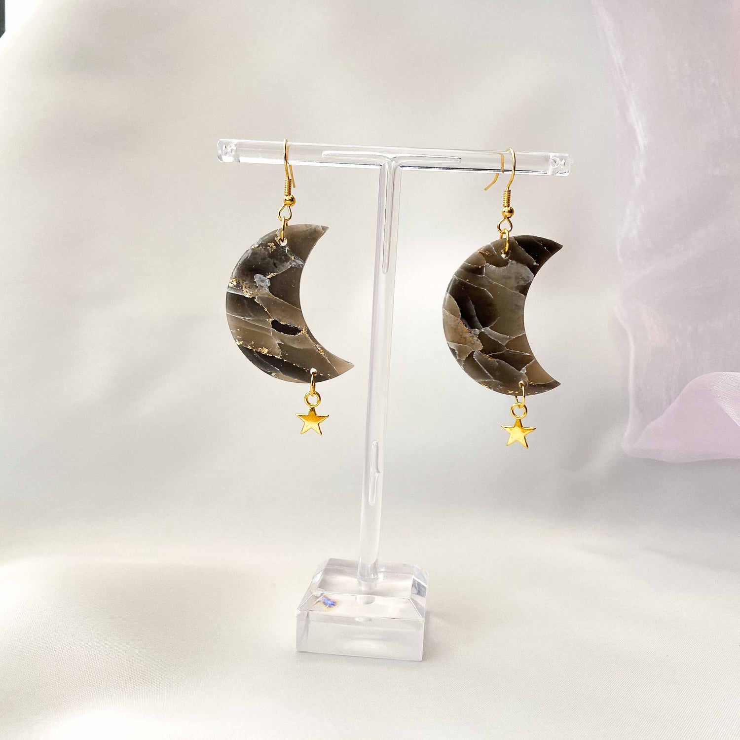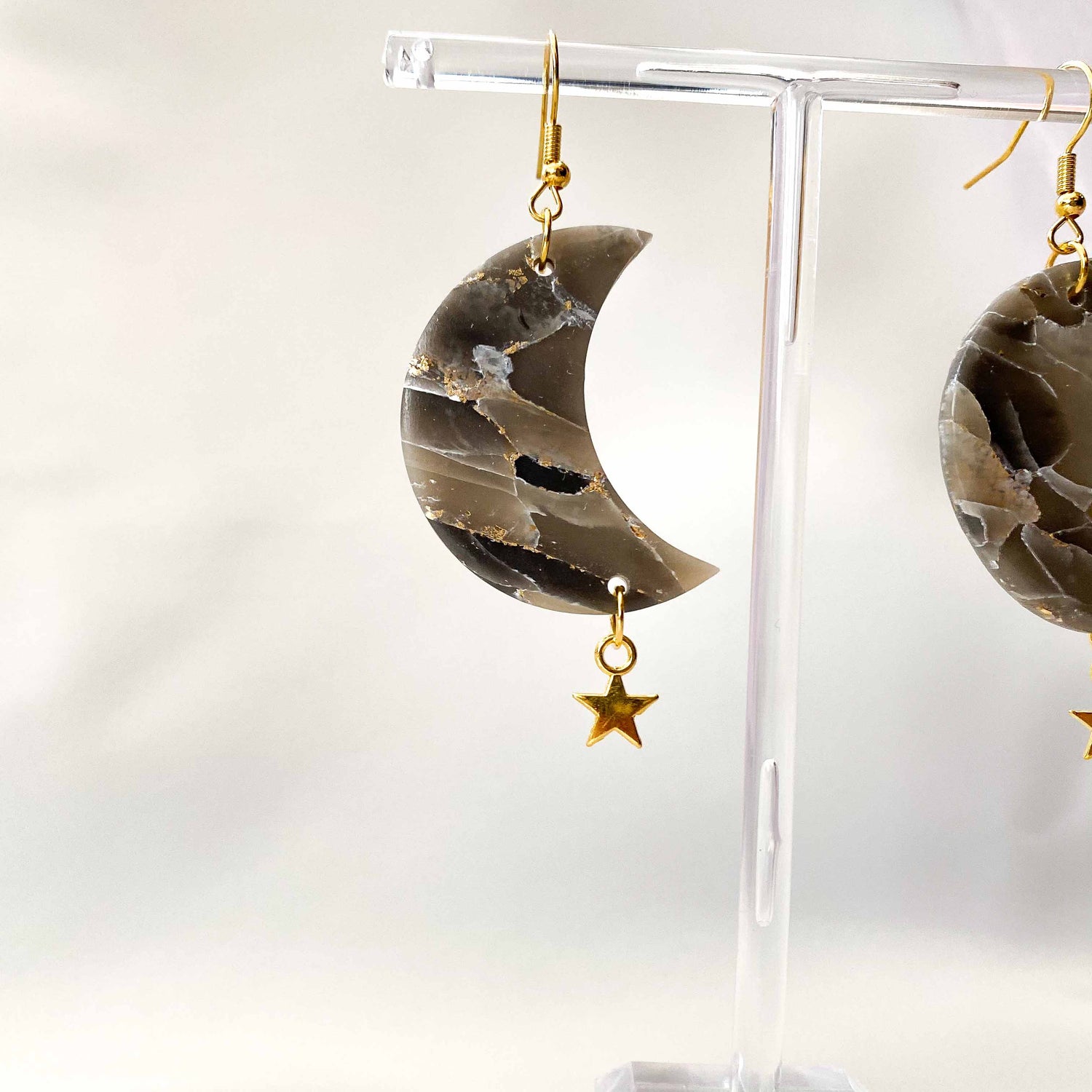 Handmade moon earrings made with a grey quartz design, featuring gold leaf and gold star charms.