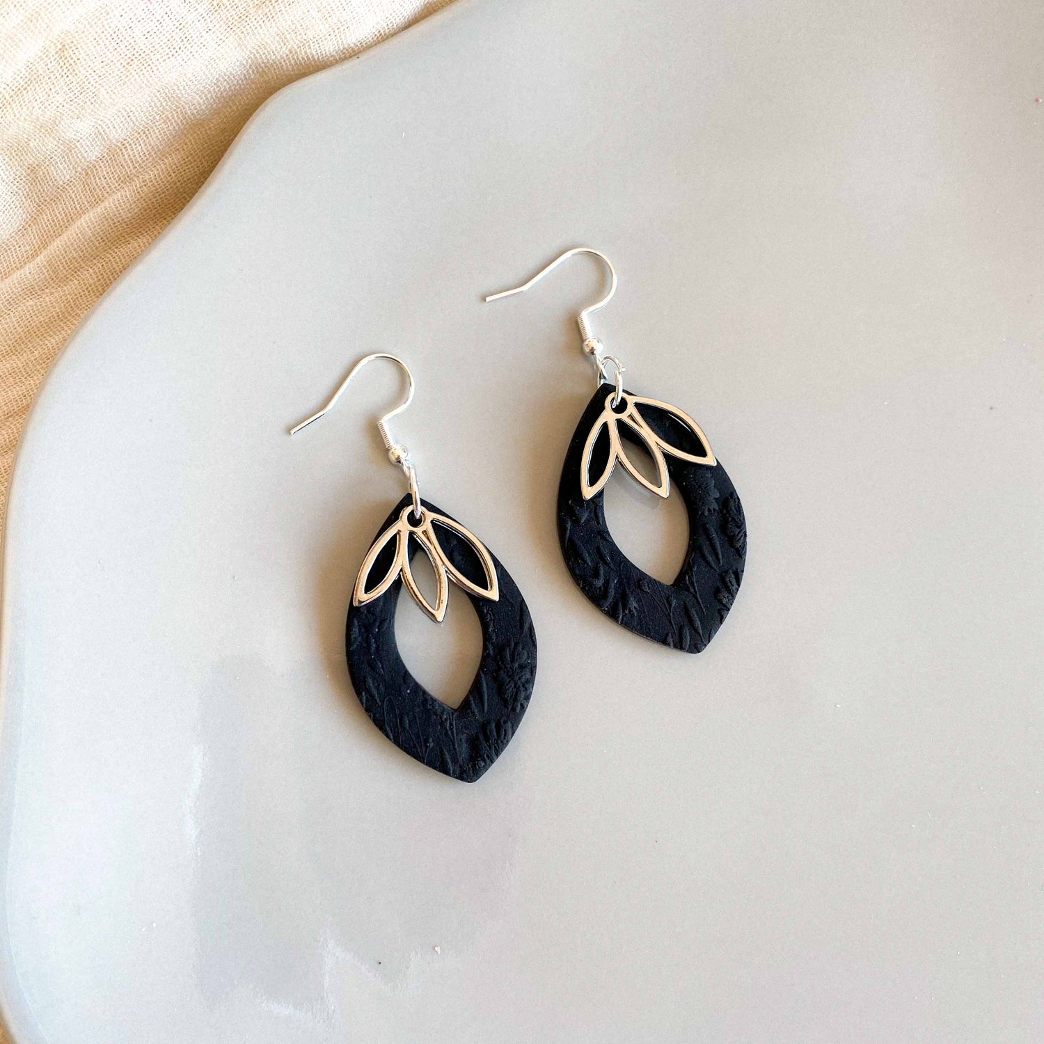 Polymer clay oval style earrings in a textured floral design with a petal charm.