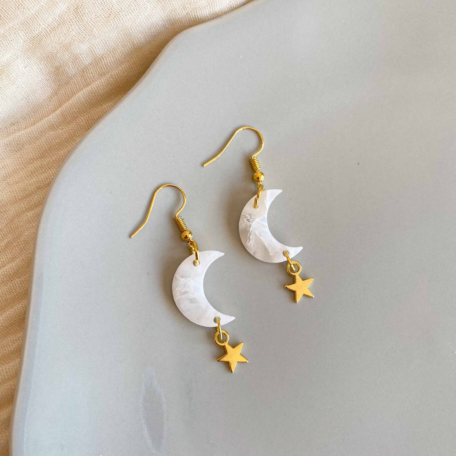 Polymer clay moon style earrings in a white crystal design with star charms.